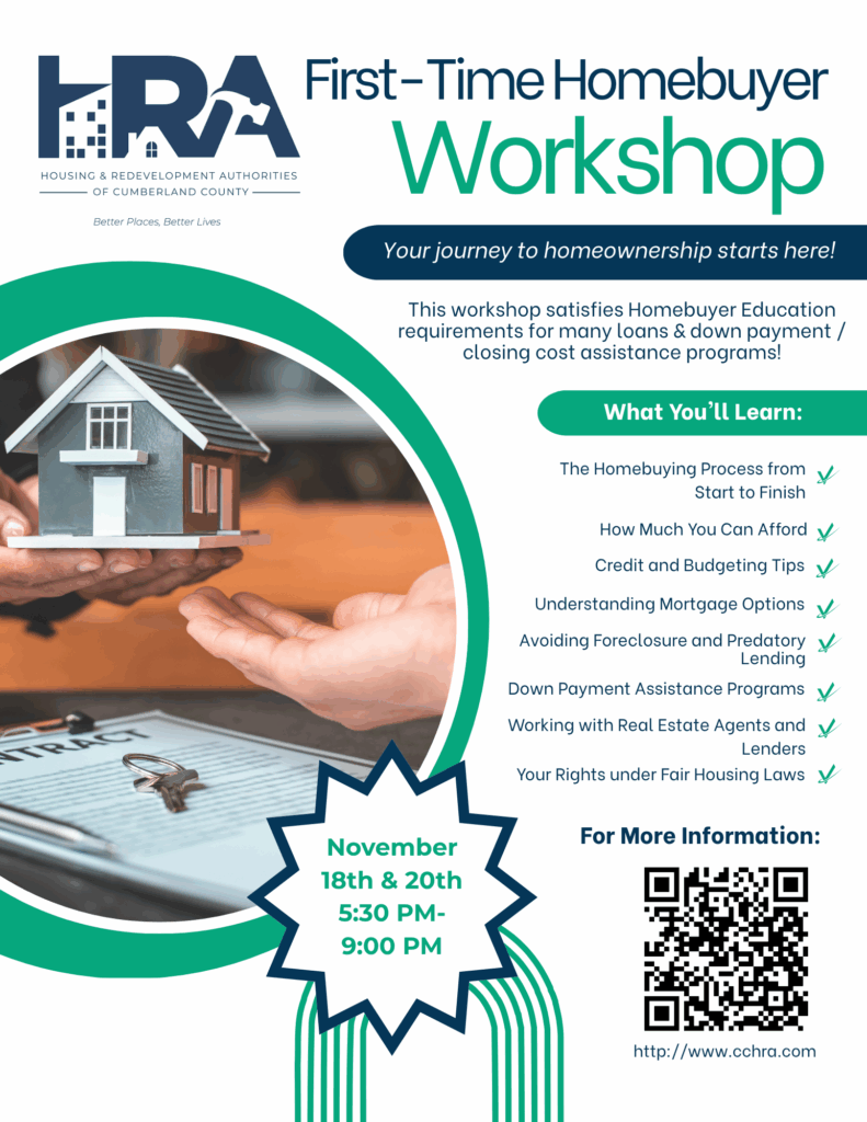 Thank you for your interest in our First-Time Homebuyer Workshop! This workshop is provided free of charge by the Housing and Redevelopment Authority of Cumberland County (CCHRA), in partnership with the Pennsylvania Housing Finance Agency (PHFA). Our mission is to expand homeownership opportunities for low- and moderate- income residents throughout Cumberland County by providing homebuyer education and housing counseling services.